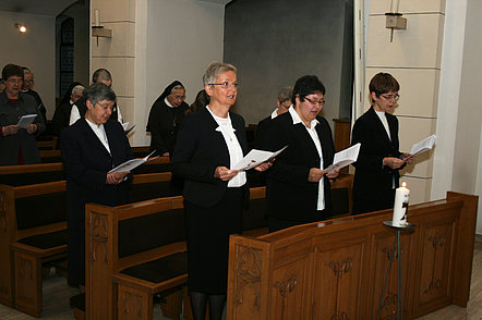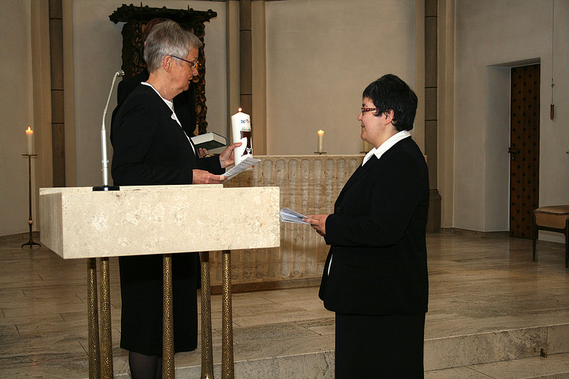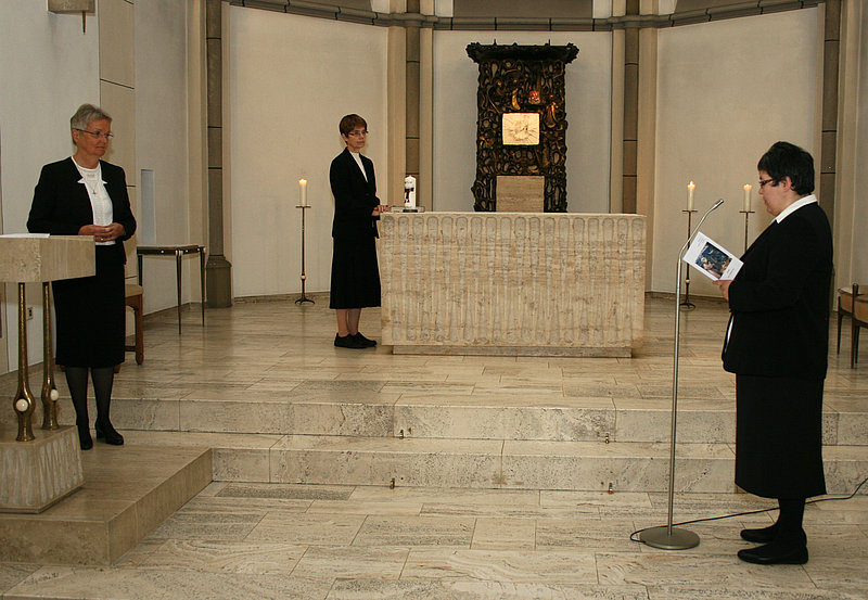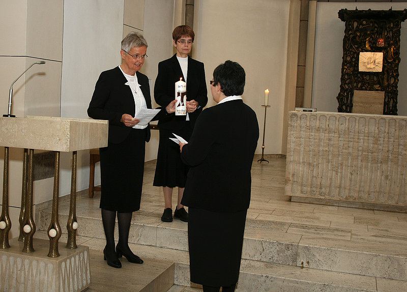 Yasmin Fengler (rechts) bittet Generaloberin Schwester Edith-Maria Magar (links) um die Aufnahme ins Noviziat. Am Altar steht Schwester M. Michaele Rohde, die Formationsleiterin.