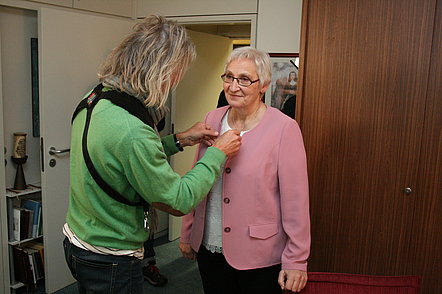 Der Tontechniker Marcus Siegle steckt der Assoziierten Veronika Sauer ein Mikrophon an.