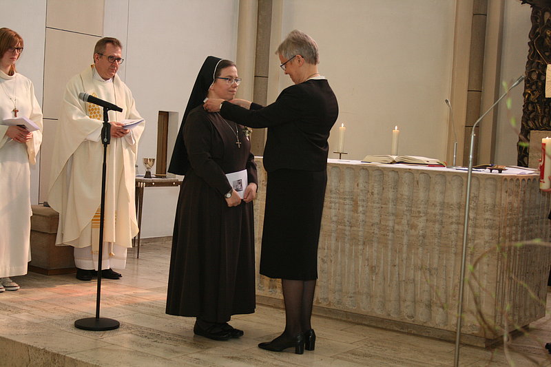 Als Symbol der Zugehörigkeit zur Ordensgemeinschaft erhält Schwester Dorothea-Maria Slabschie aus den Händen von Schwester Edith-Maria Magar das große Waldbreitbacher Kreuz.