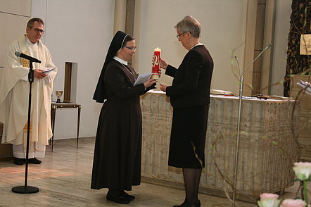 Schwester Dorothea-Maria Slabschie erhält von Schwester Edith-Maria Magar eine brennende Kerze als Sinnbild für Christus als Licht der Welt. Fotos: Andrea Schulze
