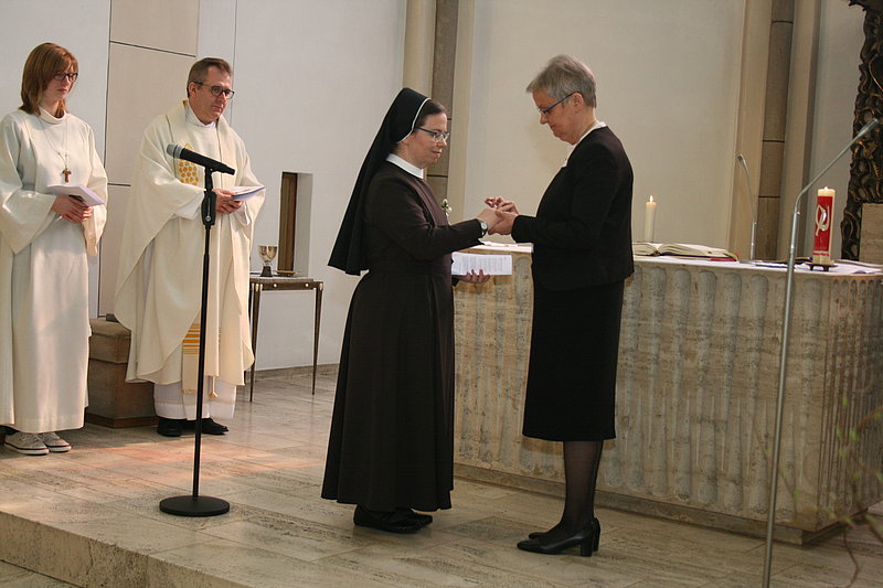 Als Zeichen für das Bündnis mit Gott steckt Schwester Edith-Maria Magar Schwester Dorothea-Maria Slabschie (links) den Trauring an den Finger.