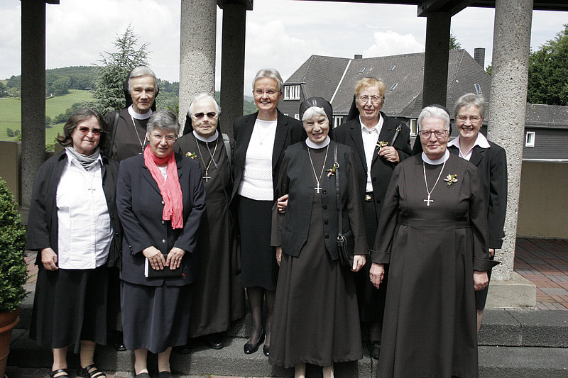 Schwester M. Oliveria Scherer (2. von links), Schwester M. Lucia Weß-lowski (4. von links), Schwester M. Gustava Weber (4. von rechts), Schwester M. Esther Rivinius (3. von rechts) und Schwester M. Edeltrud Schirra (2. von rechts) feierten Mitte Juni ihr goldenes Ordensjubiläum. Mit ihnen freuen sich die Generalrätinnen Schwester Evamaria Durchholz (links), Schwester Jutta Maria Musker (3. von links), die Generalvikarin Schwester Gerlinde-Maria Gard (rechts) und die Generaloberin Schwester Edith-Maria Magar (Mitte).