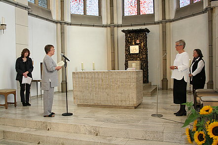 Margit Haas (2. von links) und Renate Knoepffler (2. von rechts) stehen nach ihrem Versprechen gemeinsam mit Generaloberin Schwester Edith-Maria (links) und Schwester Evamaria Durchholz vor dem Altar.