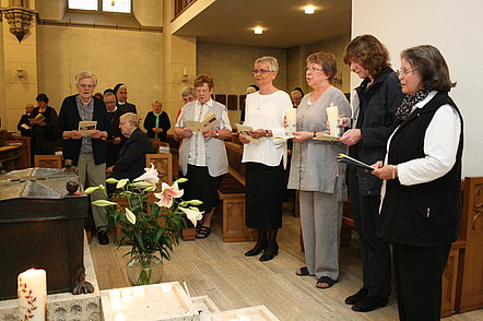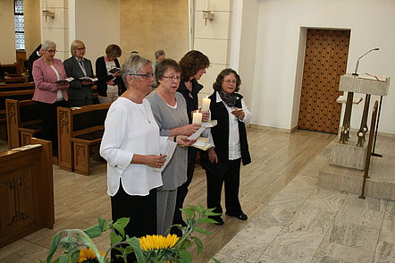 Gemeinsam mit Schwester Edith-Maria (4. von rechts) und Schwester Evamaria (rechts) bitten die Assoziierten um die Fürsprache Mutter Rosas.