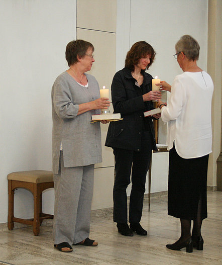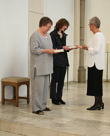 Schwester Edith-Maria überreicht Margit Haas (links) und Renate Knoepffler (Mitte) eine neue Ausgabe des Neuen Testaments ...
