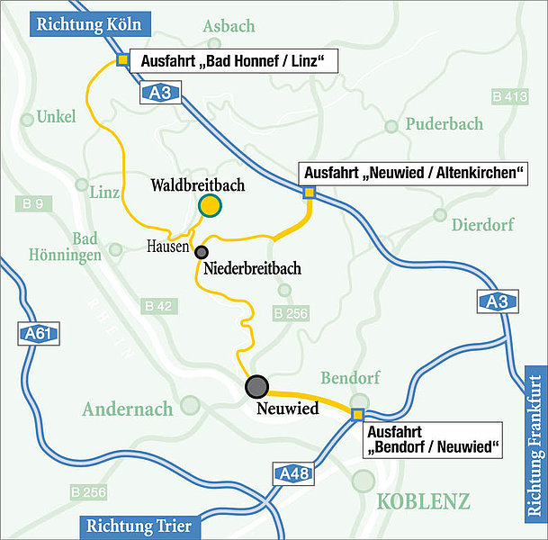 B42 bis Bad Hönningen, dann Richtung Waldbreitbach